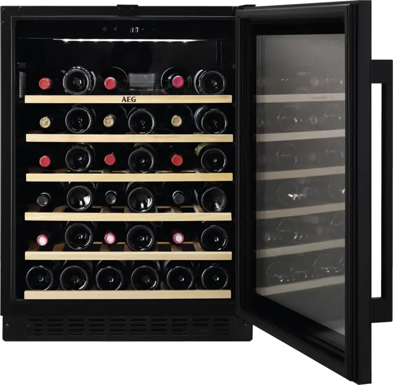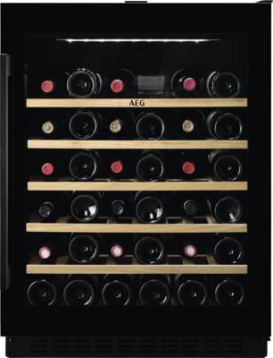 Inbouw wijnkoelkast, Geschikt voor onderbouw, 145 l Inhoud, Temperatuurzones: 1, 6 Houten legplateaus, 6, Binnenverlichting, LED, Glazen deur, Energieklasse G, netto breedte: 59,5 cm, netto hoogte: 82 cm, netto diepte: 56,5 cm