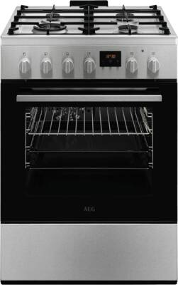 Vrijstaand fornuis, Electrische bakoven, 57 l Inhoud, Opbergvak/la, oven functies Ontdooien, Grill, Hetelucht, Hetelucht (vochtig), Bedieningsknoppen verzinkbaar, Display, Timer, Gaskookplaat, 4 Kookzones, Seperate bediening, Voorzijde, Energieklasse A, netto breedte: 60 cm, netto hoogte: 85,7 cm, netto diepte: 60 cm