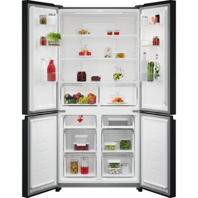 Multidoor/ Frenchdoor, Vierdeurs, Gezamenlijke inhoud koelen en vriezen: 600l, 429 l Inhoud koelgedeelte, Automatisch ontdooisysteem koelgedeelte, Koeling door luchtcirculatie, 2 Glasplateaus, 2 Groentelade(n), LED verlichting, 171 l Inhoud vriesgedeelte, 4 Lade, NoFrost, Supervriezen, Display, Touch-functie, Energieklasse D, netto breedte: 91 cm, netto hoogte: 190,5 cm, netto diepte: 69 cm