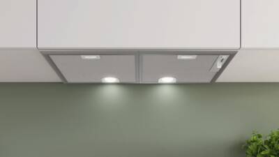 Inbouw afzuigunit, Afvoer, Om te bouwen naar / geschikt voor recirculatie, maximale luchtafvoer: 614 m³/h, maximale luchtrecirculatie: 324 m³/h, LED verlichting, Aluminium vetfilter, Energieklasse D, netto breedte: 73 cm, netto hoogte: 21,5 cm, netto diepte: 38 cm