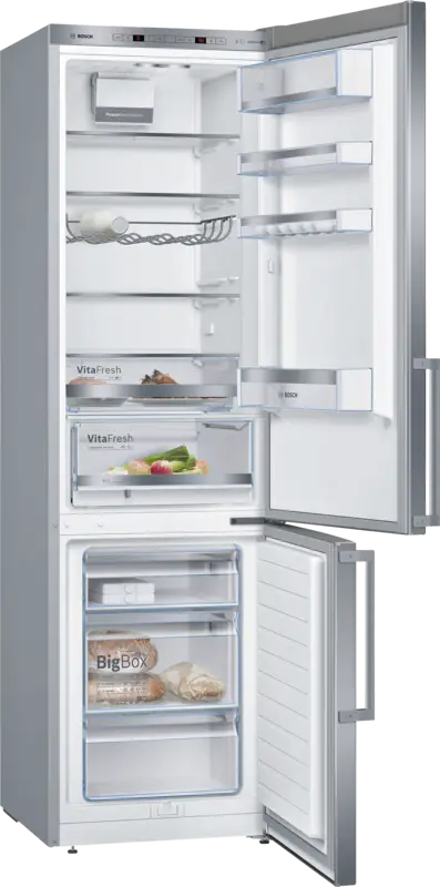 Koel-/vriescombinatie, 249 l Inhoud koelgedeelte, Automatisch ontdooisysteem koelgedeelte, Superkoelen, Flessenplateau/rek (liggend), 5 Glasplateaus, 1 Groentelade(n), LED verlichting, 94 l Inhoud vriesgedeelte, BigBox [XXL]:1, 2 Lade, Digitale temperatuurweergave, Koel-/vriesgedeelte apart regelbaar, Energieklasse B, Go Green criteria, netto breedte: 60 cm, netto hoogte: 201 cm, netto diepte: 65 cm