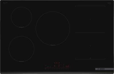 Inductie kookplaat, Bediening voorzijde, DirectSelect, 5 Kookzones, Combinatiezones: 1, bruikbaar als twee aparte of één grote kookzone, Panherkenning, 17 Standen, PerfectFry Plus, Power Managment, QuickStart, PowerBoost, Favorieten knop, Pauze functie, ReStart, Timer, Facet geslepen, Home Connect (bediiening via Smartphone of Tablet mogelijk), Via app te bedienen, netto breedte: 80,2 cm, netto hoogte: 5,1 cm, netto diepte: 52,2 cm
