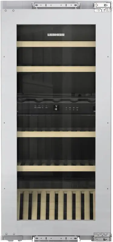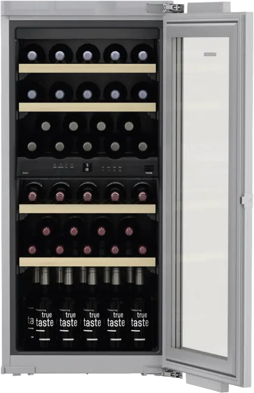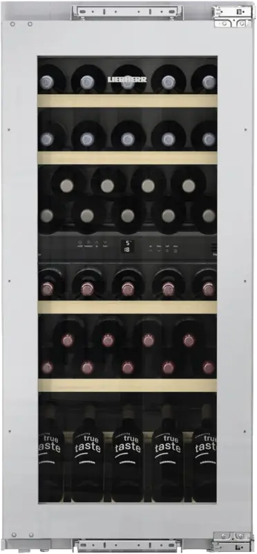 Inbouw wijnkoelkast, 159 l Inhoud, Temperatuurzones: 2, regelbare koelcircuits: 2, Digitale temperatuurweergave, 5 Houten legplateaus, Binnenverlichting, LED, Schakelbaar, Dimbaar, Glazen deur, Energieklasse G, netto breedte: 55,7 cm, netto hoogte: 121,8 cm, netto diepte: 55,3 cm