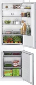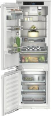 Inbouw-koel-/vrieskombinatie, Vaste deur montage, 184 l Inhoud koelgedeelte, Superkoelen, Flessenplateau/rek (liggend), 1, 5 Glasplateaus, VarioSafe (de ideale bewaarplaats voor kleine levensmiddelen zoals tubes en potjes), 70 l Inhoud vriesgedeelte, 3 Lade, VarioSpace, NoFrost, LED verlichting, Display, Kleur, 2,4 inch, 6,1cm, Touch-functie, Digitale temperatuurweergave, Koel-/vriesgedeelte apart regelbaar, Smart Device geintegreerd, Via app ondersteunde gegevensoverdracht, Via app te bedienen, Energieklasse D, Made in Germany, netto breedte: 55,9 cm, netto hoogte: 177 cm, netto diepte: 54,6 cm