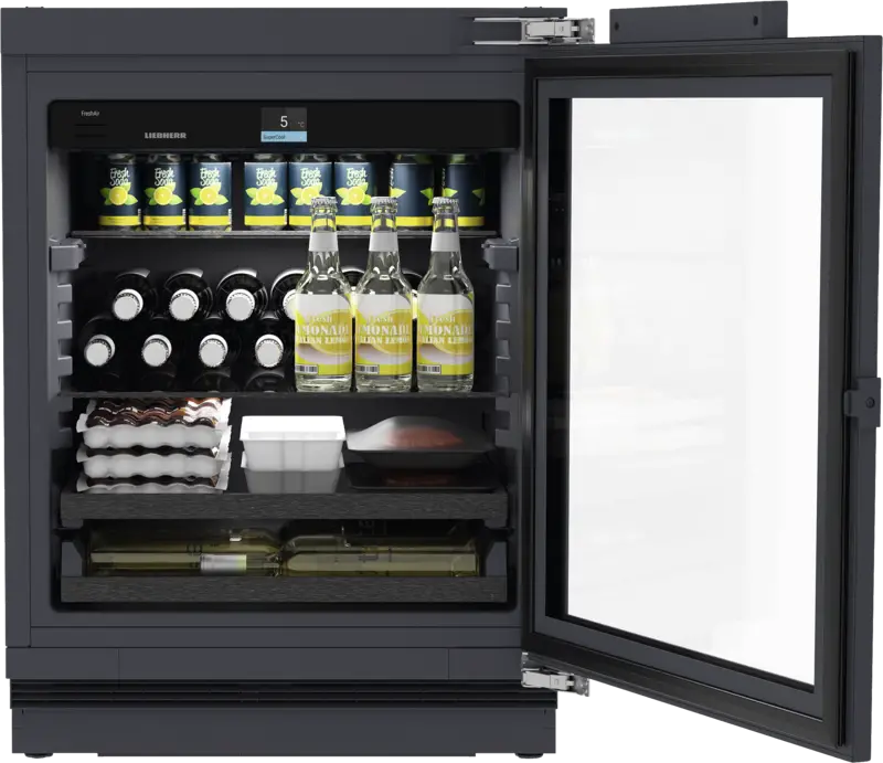 Flessen-/drankenkoelkast, Zonder vriesvak, Industrieel gebruik, Integreerbaar, Kan onder kastje opgehangen worden, Vaste deur montage, 104 l Inhoud koelgedeelte, Superkoelen, Glazen deur, LED verlichting, Display, Kleur, Touch-functie, Digitale temperatuurweergave, Smart Device geintegreerd, Via app ondersteunde gegevensoverdracht, Via app te bedienen, Energieklasse B