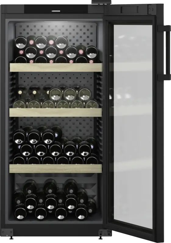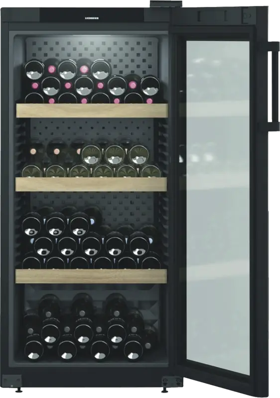 Wijnkast, Wijnklimaat kast, 272 l Inhoud, Temperatuurzones: 1, regelbare koelcircuits: 1, Digitale temperatuurweergave, Buitenzijde, 3 Houten legplateaus, Binnenverlichting, LED, Schakelbaar, Dimbaar, Glazen deur, Smart Device mogelijk dmv optionele SmartDeviceBox, Via app ondersteunde gegevensoverdracht, Via app te bedienen, Energieklasse E, netto breedte: 59,7 cm, netto hoogte: 128,4 cm, netto diepte: 73,6 cm