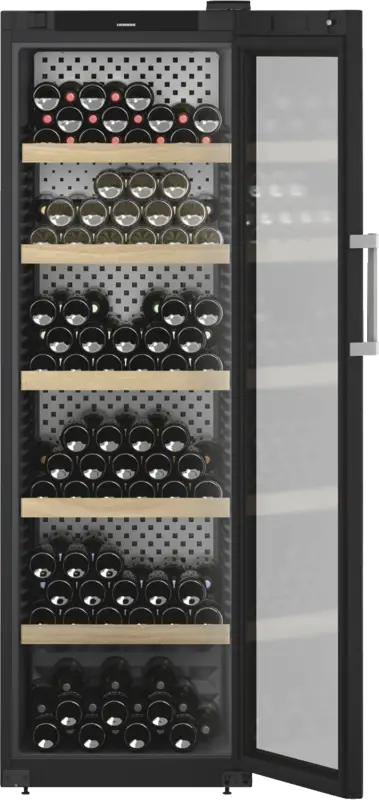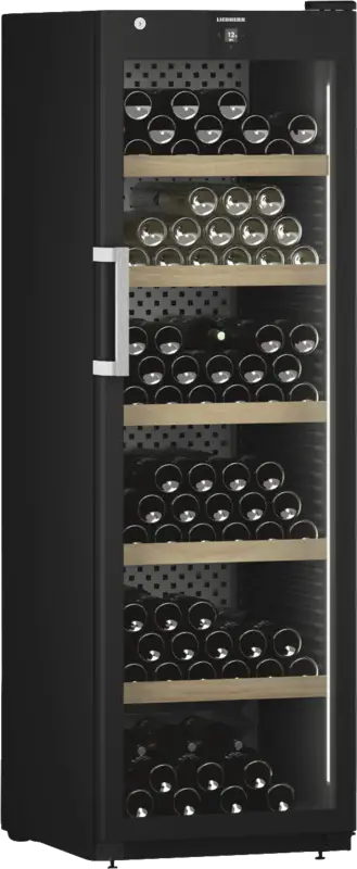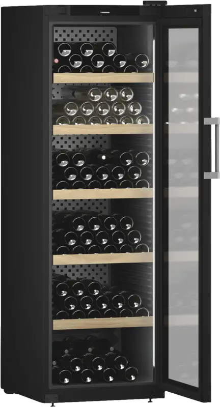 Wijnkast, Wijnklimaat kast, 442 l Inhoud, Temperatuurzones: 1, Digitale temperatuurweergave, Buitenzijde, 5 Houten legplateaus, Binnenverlichting, LED, Schakelbaar, Dimbaar, Afsluitbare deur, Glazen deur, Smart Device geintegreerd, Via app ondersteunde gegevensoverdracht, Via app te bedienen, Energieklasse F, netto breedte: 59,7 cm, netto hoogte: 188,4 cm, netto diepte: 76,3 cm