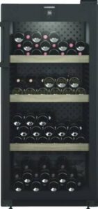 Wijnkast, Thermostaat kast, 272 l Inhoud, Temperatuurzones: 2, regelbare koelcircuits: 2, Digitale temperatuurweergave, Buitenzijde, legvlakken: 2, 4 Houten legplateaus, Binnenverlichting, LED, Schakelbaar, Dimbaar, Smart Device mogelijk dmv optionele SmartDeviceBox, Via app ondersteunde gegevensoverdracht, Via app te bedienen, Energieklasse F, netto breedte: 59,7 cm, netto hoogte: 145,4 cm, netto diepte: 67,5 cm
