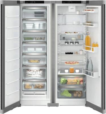 Side-by-Side Set (ook los van elkaar te gebruiken), 399 l Inhoud koelgedeelte, Automatisch ontdooisysteem koelgedeelte, Superkoelen, Koeling door luchtcirculatie, 1, 7 Glasplateaus, 1 Groentelade(n), LED verlichting, 278 l Inhoud vriesgedeelte, 4 Lade, VarioSpace, NoFrost, Supervriezen, LED verlichting, Display, Touch-functie, Digitale temperatuurweergave, Koel-/vriesgedeelte apart regelbaar, Smart Device geintegreerd, Via app ondersteunde gegevensoverdracht, Via app te bedienen, Energieklasse D, netto breedte: 119,4 cm, netto hoogte: 185,5 cm, netto diepte: 67,5 cm