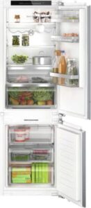 Inbouw-koel-/vrieskombinatie, Vaste deur montage, 215 l Inhoud koelgedeelte, waarvan HyperFresh, Automatisch ontdooisysteem koelgedeelte, Superkoelen, Flessenplateau/rek (liggend), 4 Glasplateaus, 75 l Inhoud vriesgedeelte, 3 Lade, NoFrost, LED verlichting, Display, Energieklasse C, netto breedte: 55,8 cm, netto hoogte: 139,5 cm, netto diepte: 54,8 cm