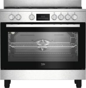 Vrijstaand fornuis, Electrische bakoven, 108 l Inhoud, 5 Bakniveaus, Katalytische reiniging, Volledig glazen binnendeur, Opbergvak/la, oven functies Ontdooien, Grill, Touch Control bediening, Display, Halogeen verlichting, Gaskookplaat, 5 Kookzones, 1 Gas wokbrander, Seperate bediening, Voorzijde, Energieklasse A+, netto breedte: 90 cm, netto hoogte: 85 cm, netto diepte: 60 cm